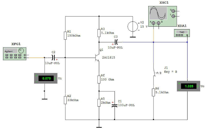 (1)在Multisim界面,构建共射极负反馈放大电路。
