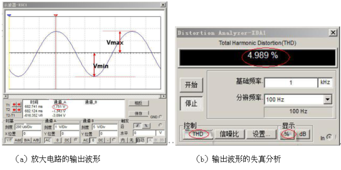 (4)在输出端接入虚拟的双通道示波器和失真分析仪,可方便快速得测试输出波形,并及时观测输出波形的失真情况,如图(a)和图(b)所示。改变交流信号源的幅值,观察示波器和失真分析仪,使输出电压值尽可能大但又不失真(理想情况下,波形的正负半周完全对称)。但不失真是相对的,在实际实验中,控制图(b)中的THD在5%~10%内即可。
