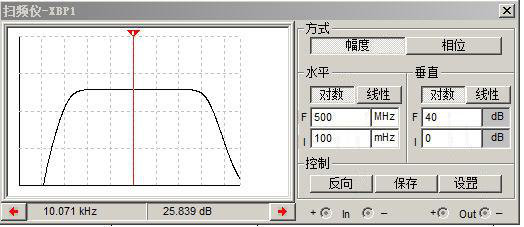 (5)在输入端和输出端正确接入虚拟扫频仪,快速准确获得放大电路的幅频特性曲线,如图所示。设置“幅度”“对数”按键,并设置其实频率和终止频率,拖动标尺可读出上限频率和下限频率值,以此推算通频带宽度,以及放大倍数db值。