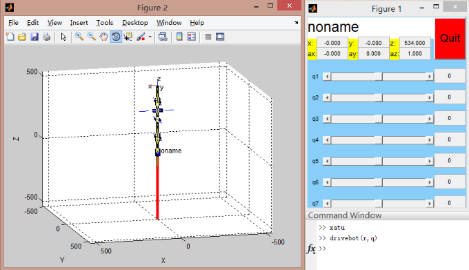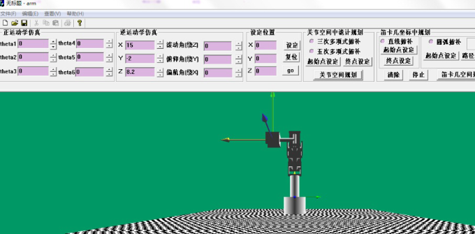 运行程序显示如下仿真界面,根据光标移动建立起机器人工作空间概念,通过多次对应关节的转动移动试验,建立数学模型参数与实物关节角变化量的关系概念,从而为了进一步实现工作任务控制实现奠定基础。