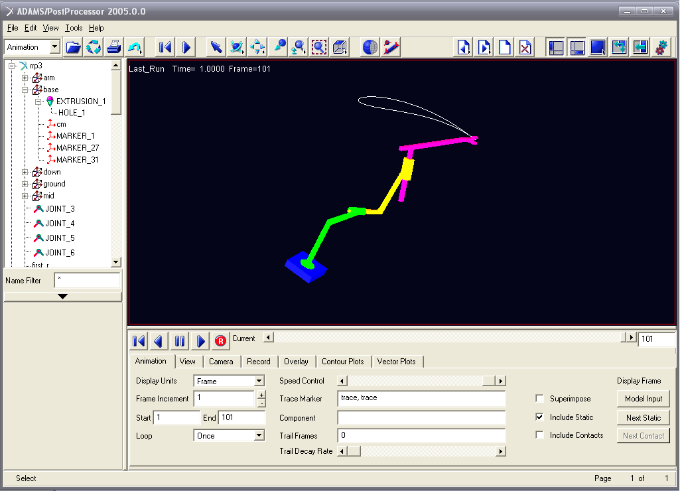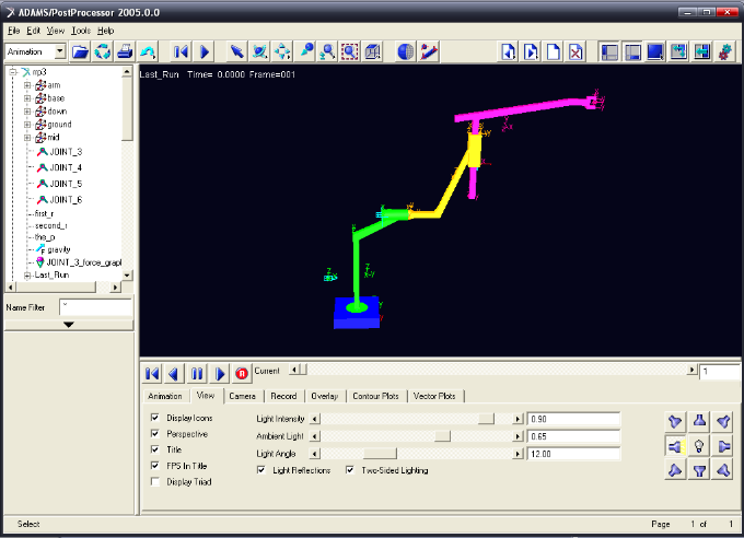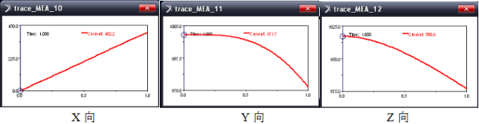 将以上的关节运动规律分别加载到ADAMS模型的各个关节的虚拟电机上,进行运动仿真得到末端轨迹的变化,同时可以检测得到笛卡尔空间内x,y,z轴的坐标信息。对应仿真实验结果可以验证初期数学模型的建立与分析,以及控制器设计的合理性,学生可以按照自己的设计完成其预期任务,并得到仿真效果。