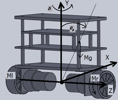 两轮自平衡机器人主要由两部分组成:车轮和车体。机器人具有3个自由度。机器人本体能够绕