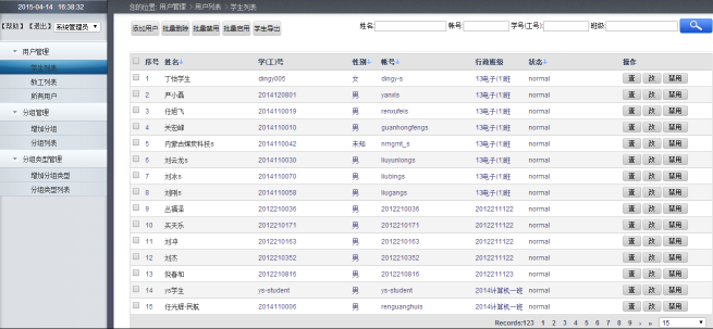 系统管理员主要对系统用户账号和实验学生班级分组进行管理,提供导入/导出、增、删、查、改功能,并对参加实验教学的角色和相应权限进行维护,根据角色的职能,赋予相应管理权限功能,同时还可以查看在线用户人数,查看用户功能访问、用户登陆记录。系统管理的主要功能如表所示,