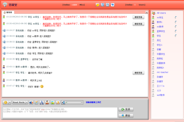 提供用户互动交流模块,包括在线实时答疑室和在线留言功能,在线实时答疑室支持多人语音、文字交流,可共享白板,保存聊天记录,问题库搜索、发送离线消息到邮箱。提供短信通知功能,当教学安排实验后,可以通过短信实时通知学生,并且可以通过短信督促未完成实验的学生。